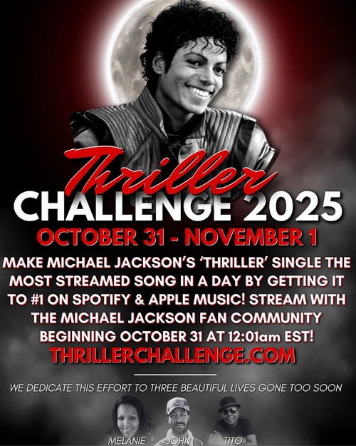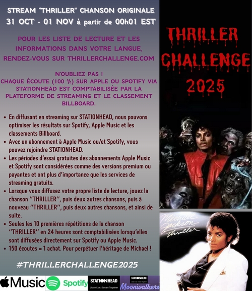 Après 2024, le site internet thrillerchallenge.com est de retour et sera réactualisé le 15 octobre (US). Pour rappel, il a été réalisé par des fans à destination du monde entier afin que le single Thriller puisse se classer au plus haut des classements avec le choix cette année de mettre l’accent sur les plateformes de streaming comme Spotify et Apple.